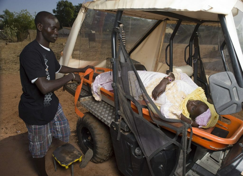 Female model in Basse shows how the Uhuru X is used to transport women in dangerous labour to healthcare facilities.